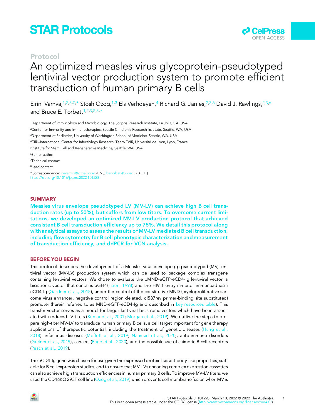 136. Vamva E, Ozog S, Verhoeyen E, James RG, Rawlings DJ, Torbett BE. An optimized measles virus glycoprotein-pseudotyped lentiviral vector production system to promote efficient transduction of human primary B cells. STAR Protoc. 2022 Mar 8;3(1):101228. doi: 10.1016/j.xpro.2022.101228. PMID: 35284833; PMCID: PMC8914380.