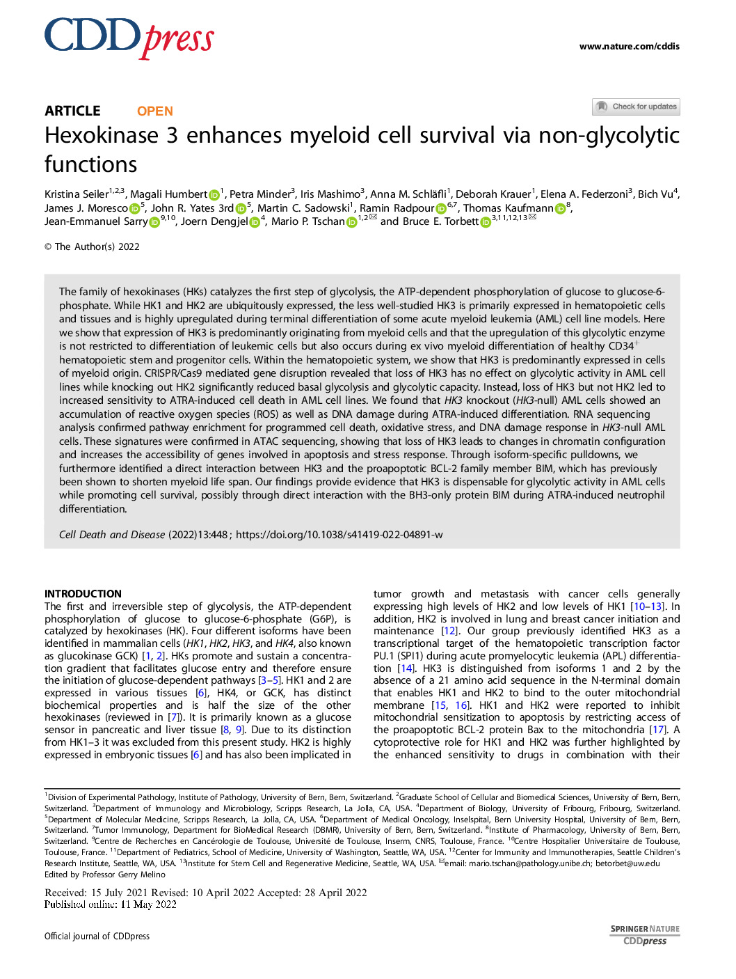 138. Seiler, K., Humbert, M., Minder, P., Mashimo, I., Schläfli, A.M., Krauer, D., Federzoni, E.A., Vu, B., Moresco, J.J., Yates, J.R. and Sadowski, M.C., 2022. Hexokinase 3 enhances myeloid cell survival via non-glycolytic functions. Cell death & disease, 13(5), pp.1-14. PMID: 35538058