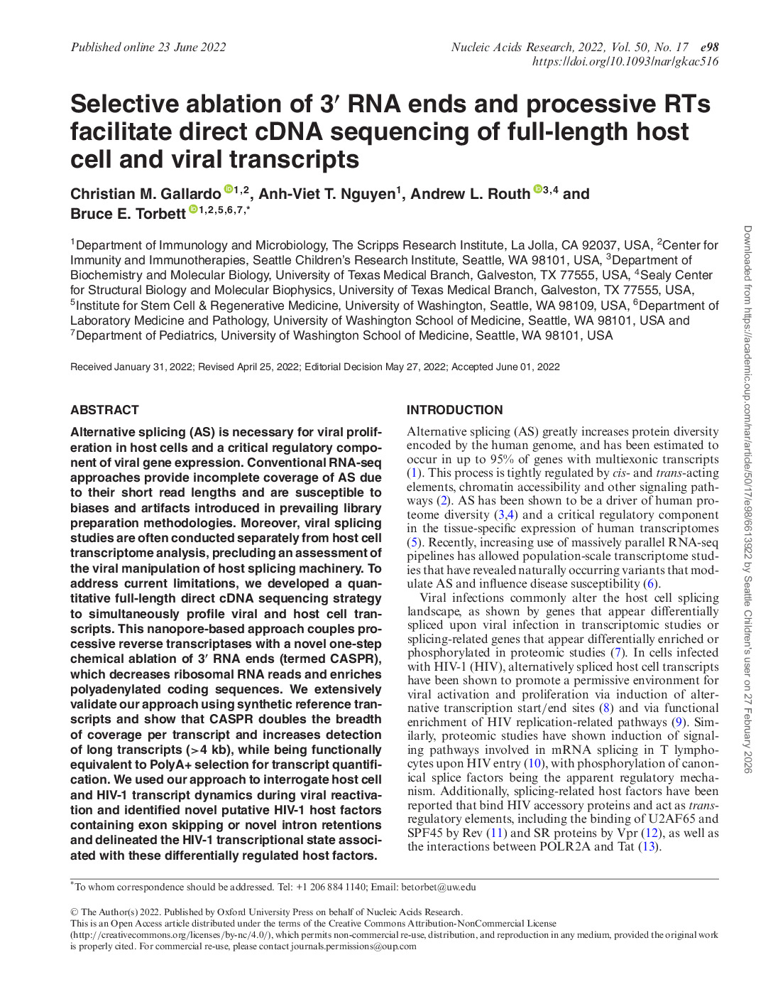 139. Gallardo CM, Nguyen AT, Routh AL, Torbett BE. Selective Ablation of 3′ RNA ends and Processive RTs Facilitate Direct cDNA Sequencing of Full-length Host cell and Viral Transcripts. . gkac516, https://doi.org/10.1093/nar/gkac516