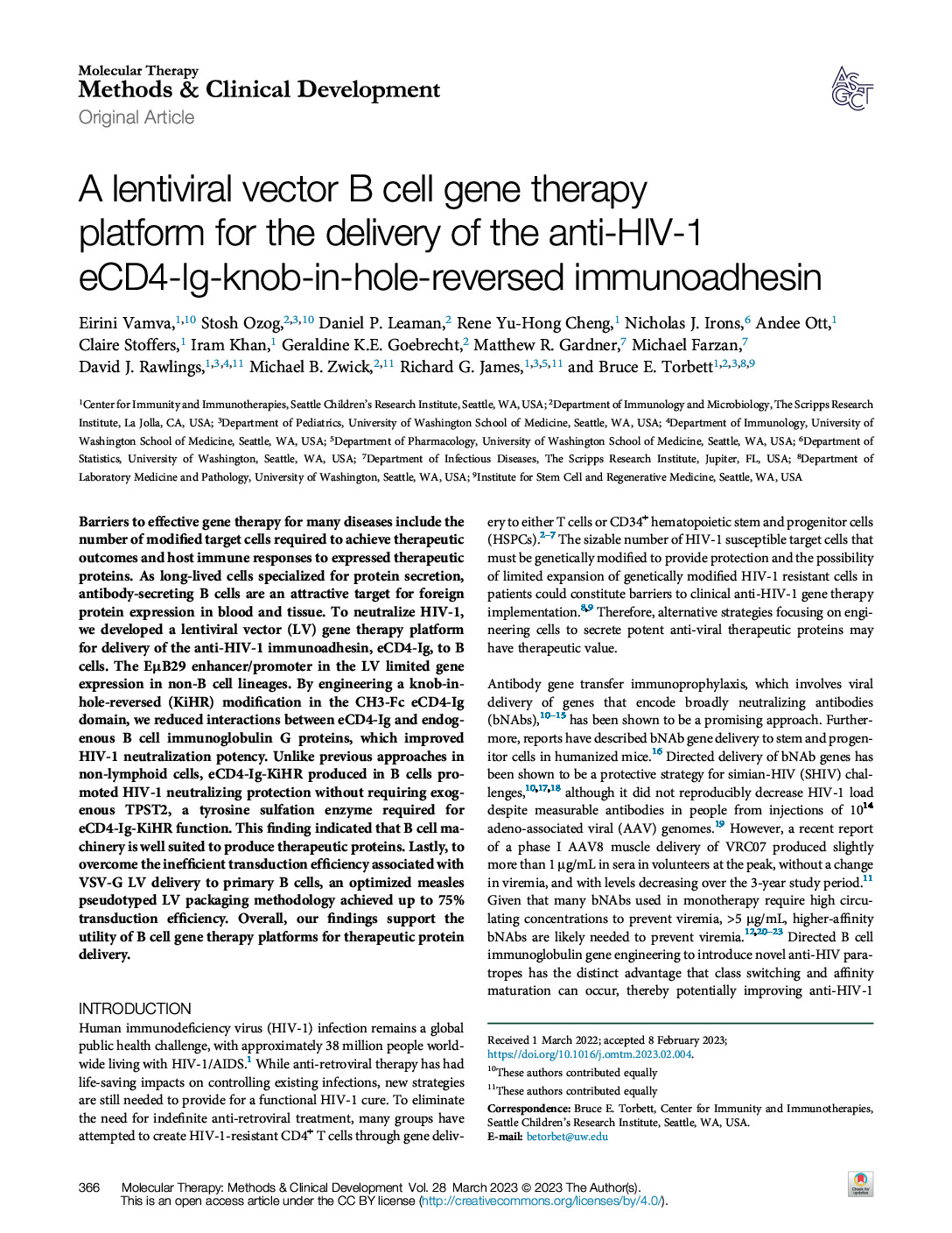 141. Vamva E, Ozog S, Leaman DP, Cheng RY, Irons NJ, Ott A, Stoffers C, Khan I, Goebrecht GK, Gardner MR, Farzan M, Rawlings DJ, Zwick MB, James RJ, Torbett BE. A lentiviral vector B cell gene therapy platform for the delivery of the anti-HIV-1 eCD4-Ig-Knob-in-Hole-Reversed immunoadhesin. Molecular Therapy-Methods & Clinical Development. 2023 Feb 11. https://doi.org/10.1016/j.omtm.2023.02.004