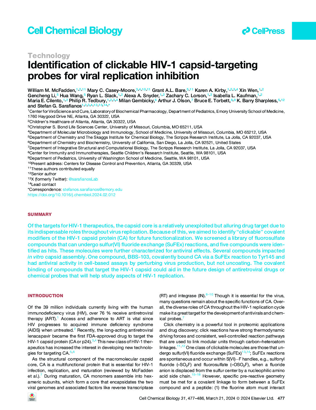 144. McFadden WM, Casey-Moore MC, Bare GA, Kirby KA, Wen X, Li G, Wang H, Slack RL, Snyder AA, Lorson ZC, Kaufman IL. Identification of clickable HIV-1 capsid-targeting probes for viral replication inhibition. Cell Chemical Biology. 2024 Mar 21;31(3):477-86, https://doi.org/10.1016/j.chembiol.2024.02.012