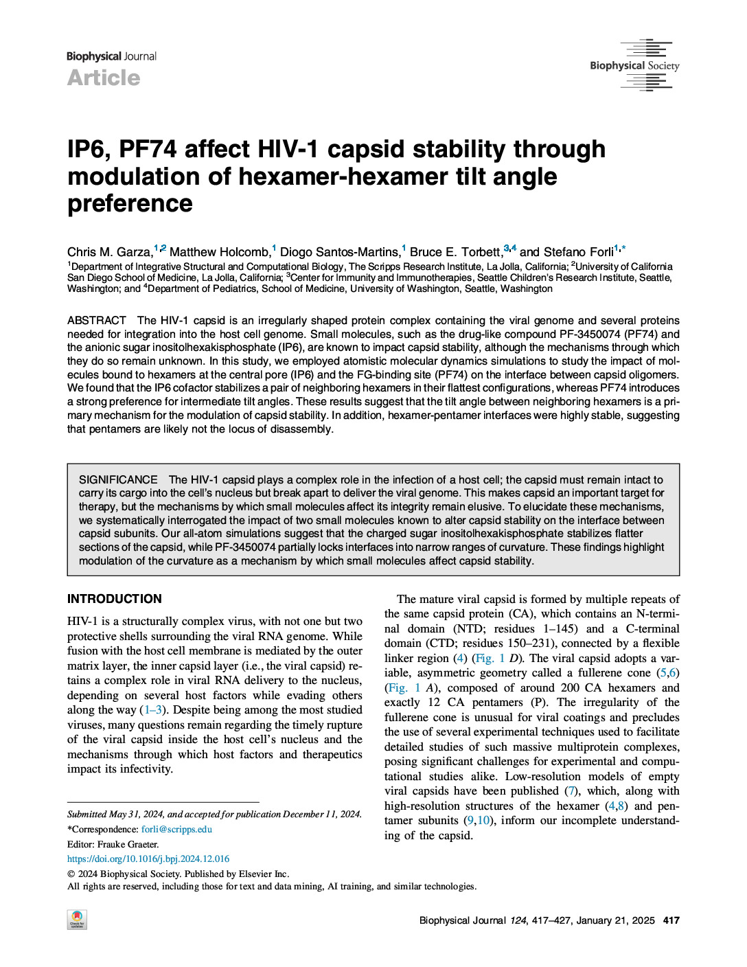 147. Garza CM, Holcomb M, Santos-Martins D, Torbett BE, Forli S. IP6, PF74 affect HIV-1 capsid stability through modulation of hexamer-hexamer tilt angle preference. Biophys J. 2025 Jan 21;124(2):417-427. https://doi: 10.1016/j.bpj.2024.12.016