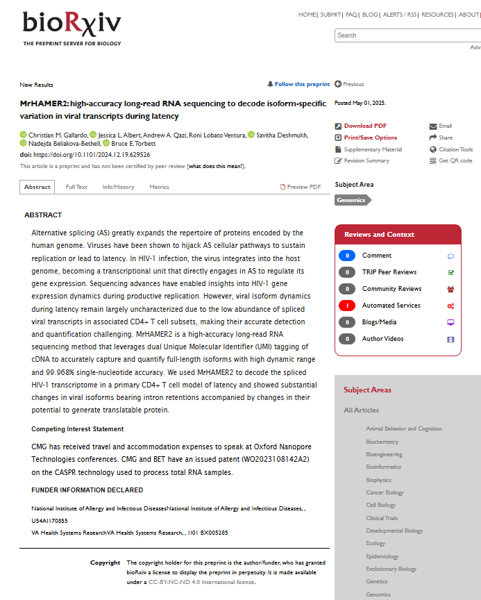 149. Gallardo CM, Albert JL, Qazi AA, Ventura RL, Deshmukh S, Beliakova-Bethell N, Torbett BE. MrHAMER2: high-accuracy long-read RNA sequencing to decode isoform-specific variation in viral transcripts during latency. Preprint. bioRxiv. 2025 May 1, https://doi.org/10.1101/2024.12.19.629526