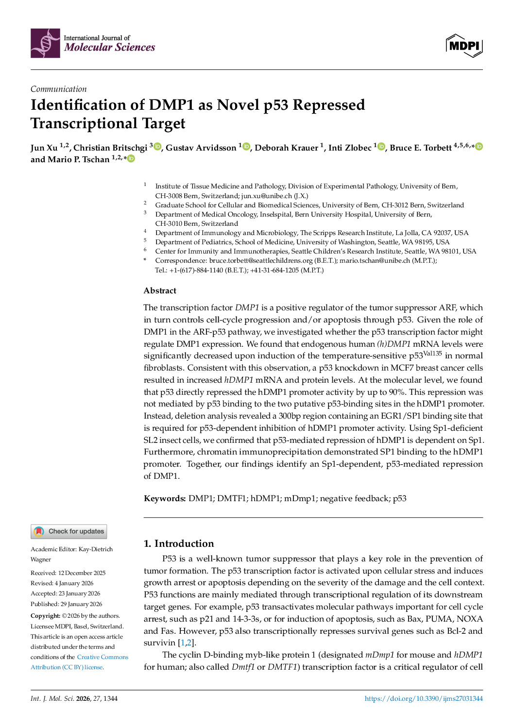 150. Xu J, Britschgi C, Arvidsson G, Krauer D, Zlobec I, Torbett BE, Tschan MP. Identification of DMP1 as Novel p53 Repressed Transcriptional Target. Int J Mol Sci. 2026 Jan 29;27(3):1344. https://doi: 10.3390/ijms27031344