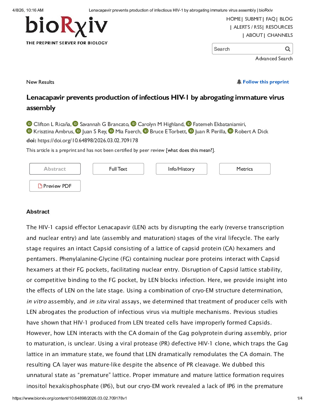 151. Ricaña CL, Brancato SG, Highland CM, Ekbataniamiri F, Ambrus K, Rey JS, Faerch M, Torbett BE, Perilla JR, Dick RA. Lenacapavir prevents production of infectious HIV-1 by abrogating immature virus assembly. bioRxiv [Preprint]. 2026 Mar 3:2026.03.02.709178. doi: 10.64898/2026.03.02.709178