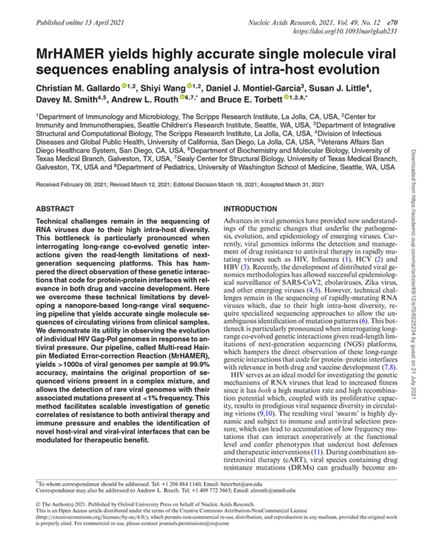 131. Gallardo CM, Wang S, Montiel-Garcia DJ, Little SJ, Smith DM, Routh AL, Torbett BE. MrHAMER yields highly accurate single molecule viral sequences enabling analysis of intra-host evolution. Nucleic Acids Res. 2021 Jul 9;49(12):e70. doi: 10.1093/nar/gkab231.PMID: 33849057