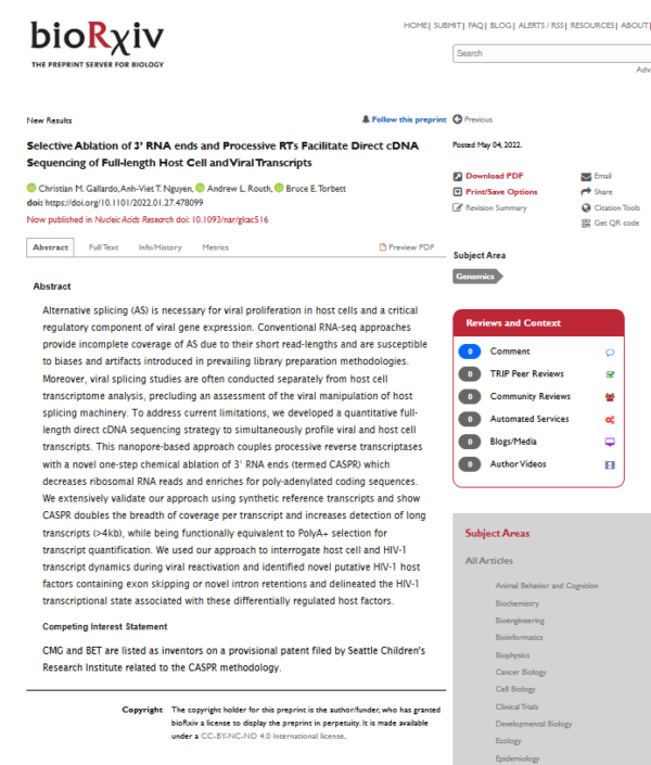 139. Gallardo CM, Nguyen AT, Routh AL, Torbett BE. Selective Ablation of 3′ RNA ends and Processive RTs Facilitate Direct cDNA Sequencing of Full-length Host cell and Viral Transcripts. . gkac516, https://doi.org/10.1093/nar/gkac516